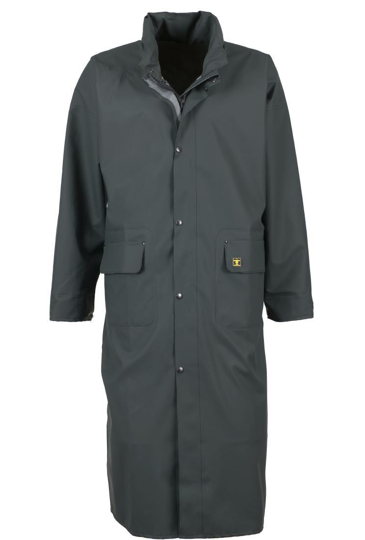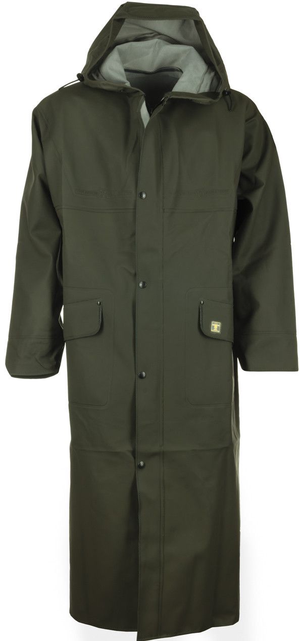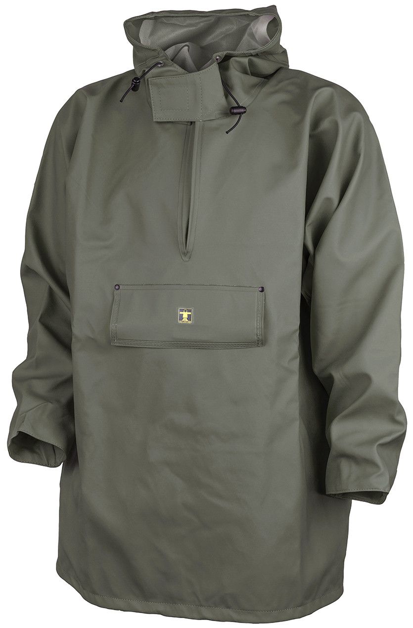 Tecido revestido resistente com soldagem de alta frequência. Casaco quimono com capuz. Fecho sob a aba dos botões de pressão. Punhos elásticos ajustáveis.