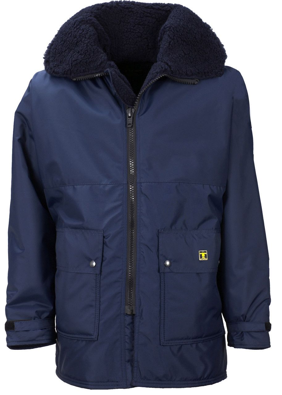 Zíper sob aba dupla com fecho de pressão. Dois bolsos impermeáveis sob a aba. Punhos elásticos com fecho de pressão e reforço.